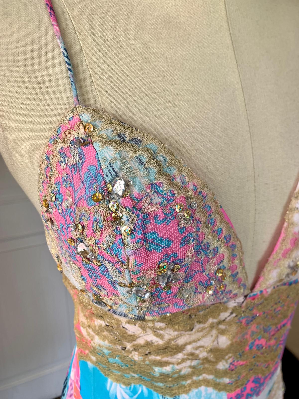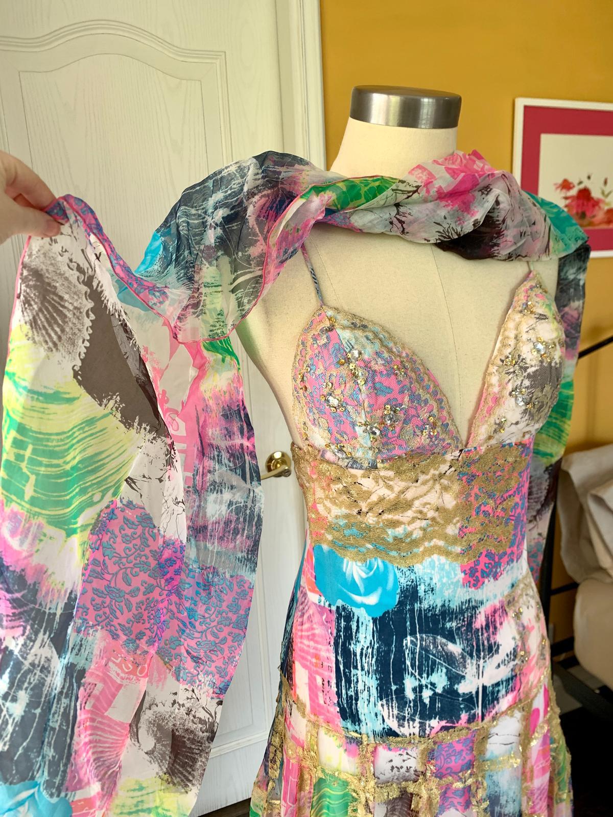 A cute, funky midi dress in a patchwork print! With pops of bright colour, gold lace trimming, and stunning embroidery on the cups. Comes with a matching organza scarf.